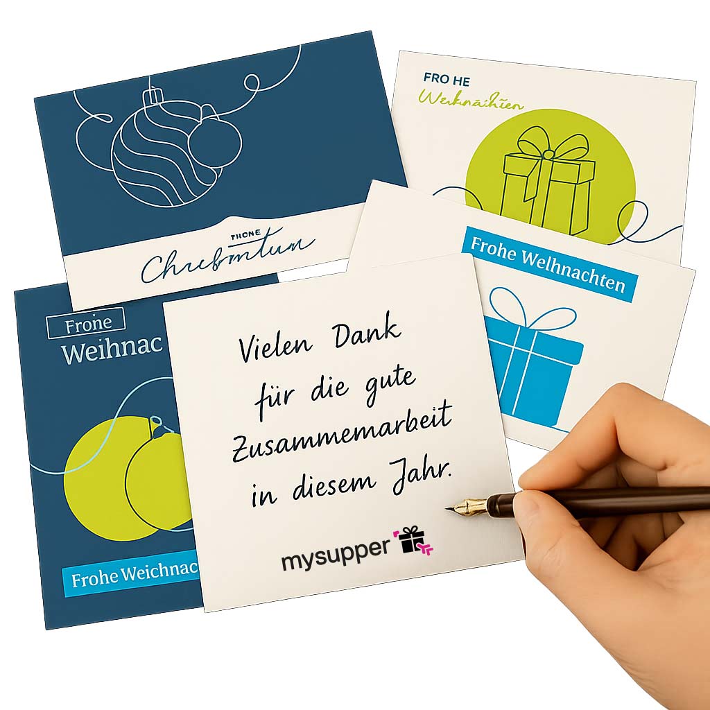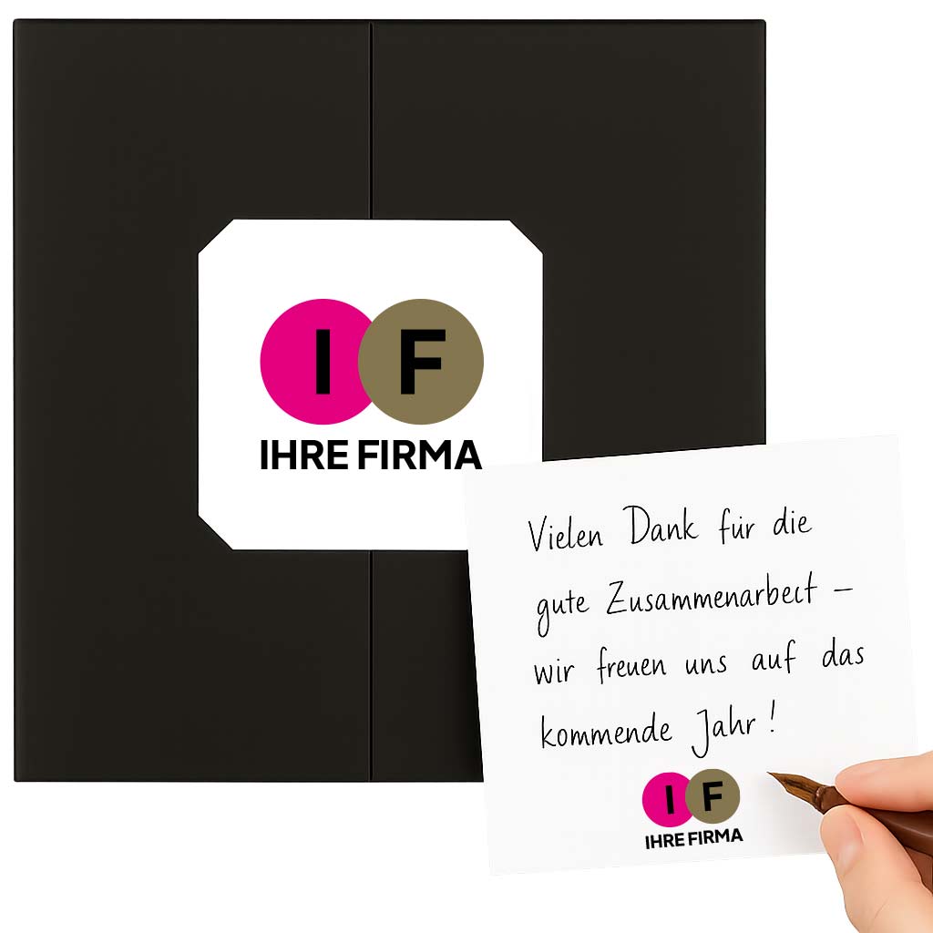 Unsere Grußkarten sind zweiseitig: vorn erscheint dein gewähltes Motiv, auf der Rückseite steht dein Grußtext. Ab 20 Präsenten integrieren wir dort gerne zusätzlich dein Firmenlogo – mittig und dezent platziert.