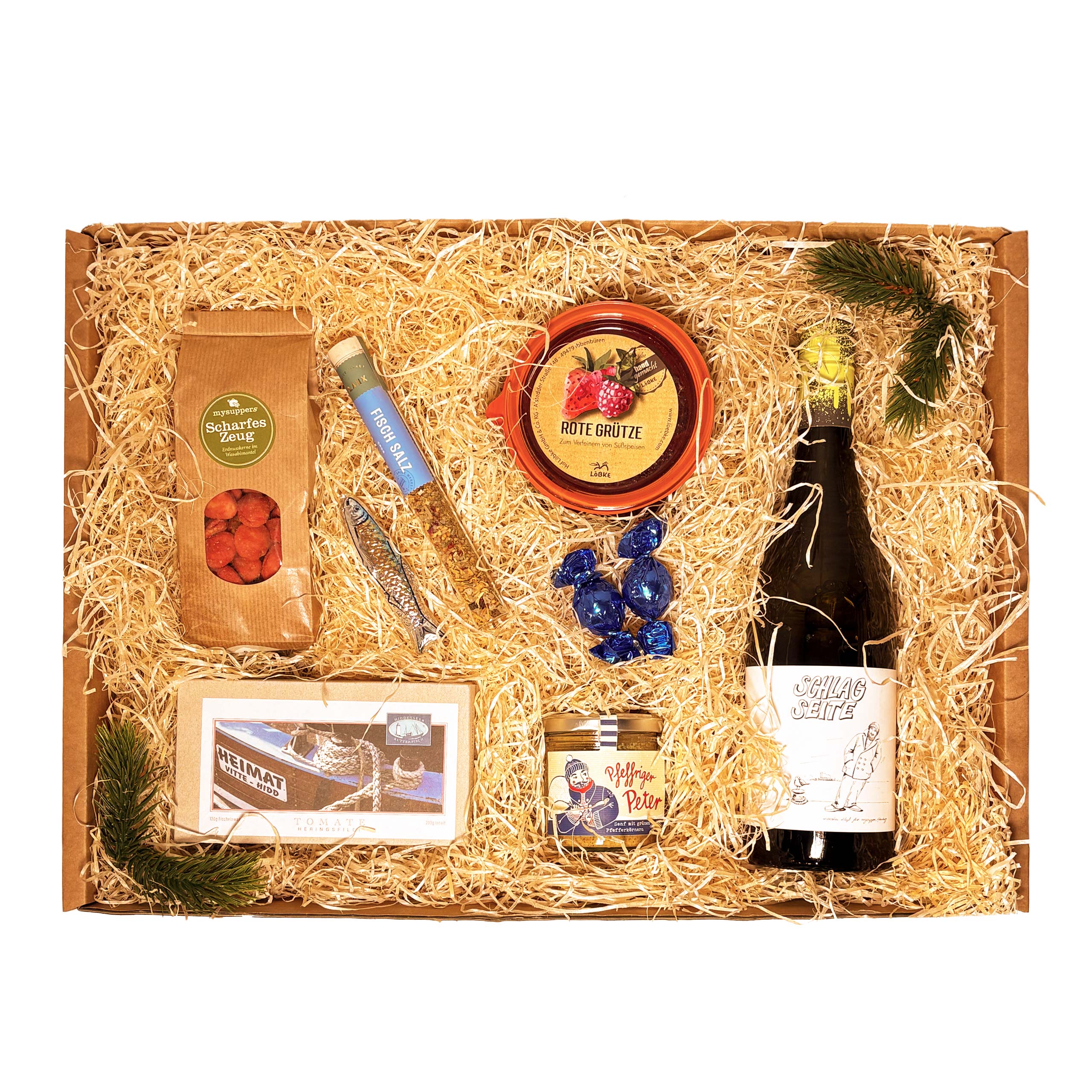 Ein hanseatisch-kulinarischer X-Mas Gruss, gespickt mit u.a. Fisch vom Hiddenseer Kutterfisch (nachhaltiger Fang), rote Grütze, Senf von Senf Pauli, edlem Weißwein mit Hamburger Jung auf dem Etikett.