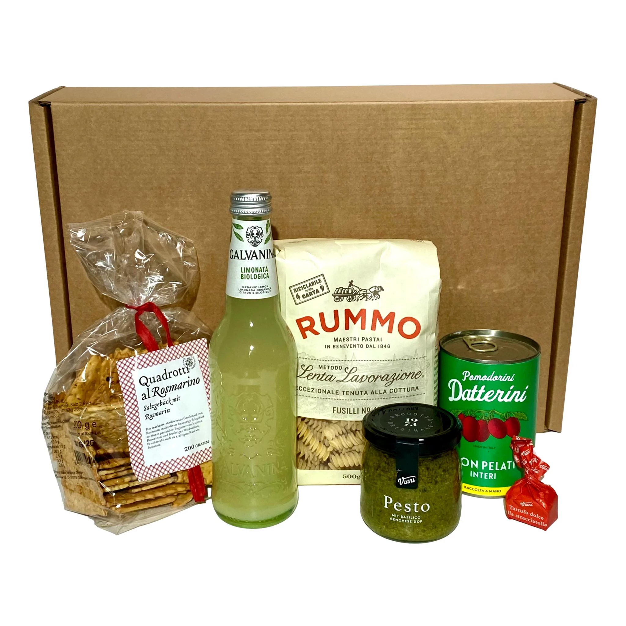 Diese Box enthält Galvanina Bio-Limonata statt Wein, Rummo-Fusilli nach der langsamen Methode sowie Viani Basilikum-Pesto DOP, handgepflückte Datterini-Tomaten und Quadrotti al Rosmarino.