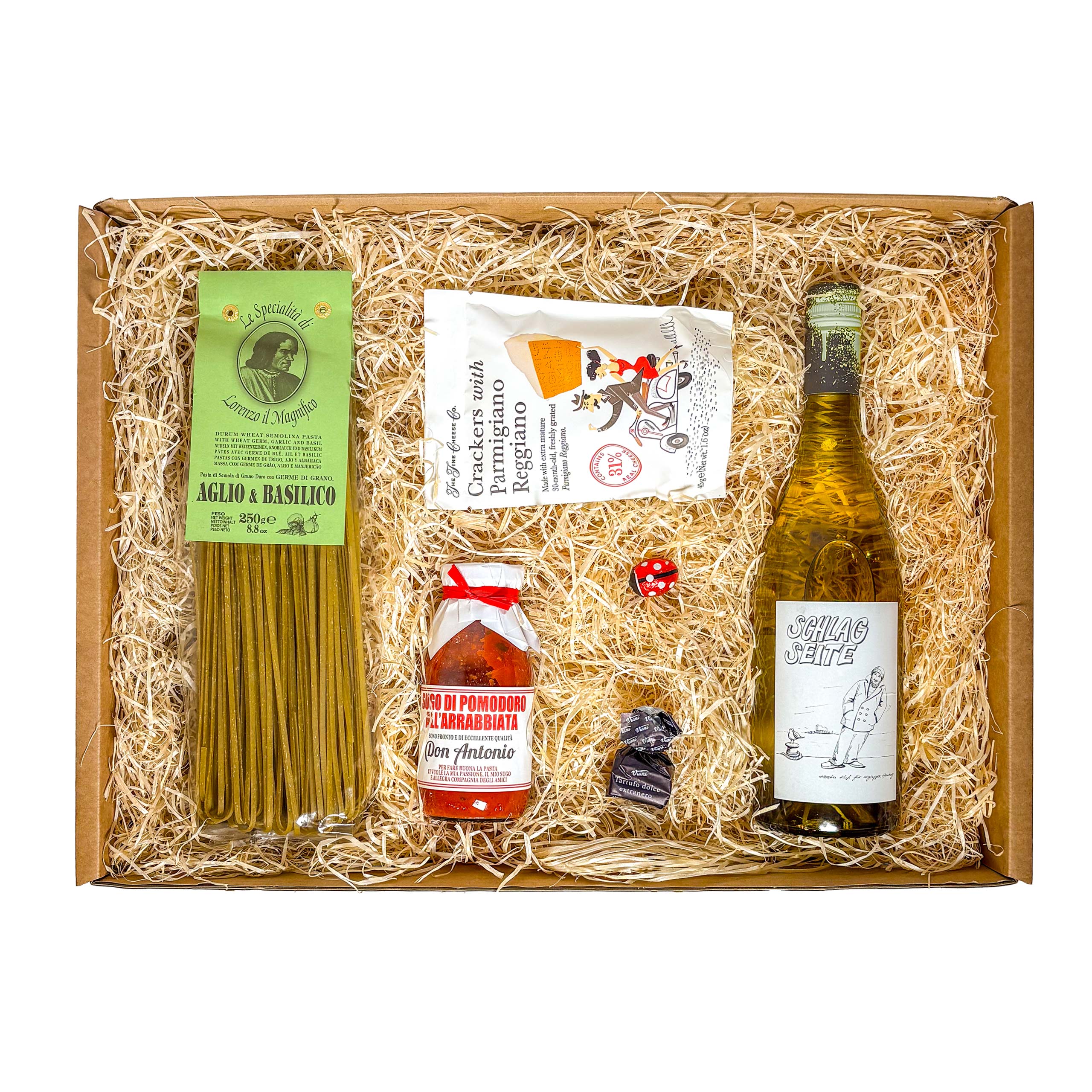 Für den Überraschungsgast, die Heißhunger-Attacke oder als geniales Beiwerk zur Lieblingsserie: Linguine mit Knoblauch und Basilikum, dazu eine fertige leicht scharfe Tomatensugo, ein fruchtig leichter Weißwein, Cracker mit Parmesan und für danach noch ein Trüffelpralinchen.