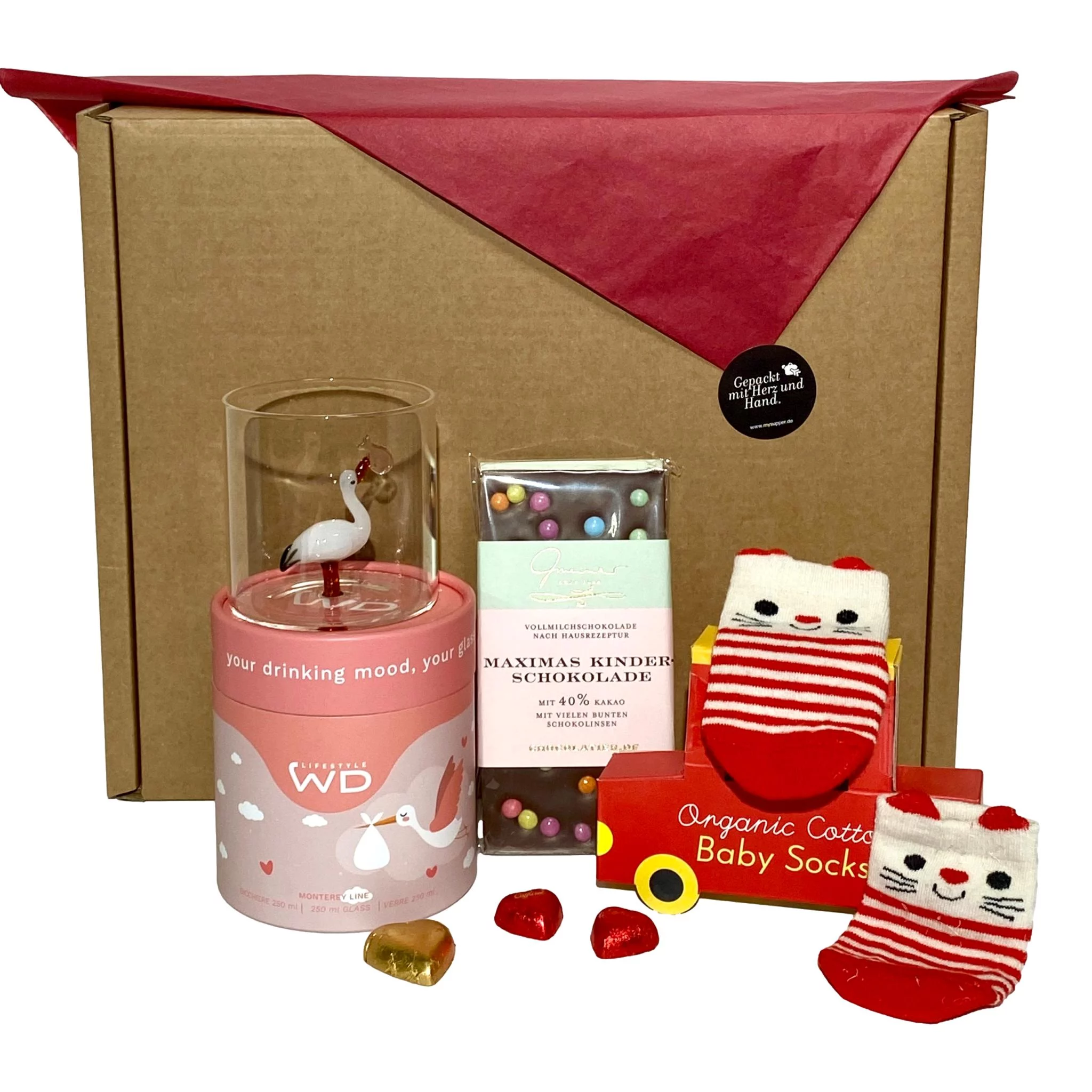 Rosa, süß und von Herzen: Diese Baby Geschenkbox für Mädchen ist eine liebevolle Überraschung zur Geburt. Mit Söckchen, Schokolade und einem handgefertigten Storchglas ist sie ein persönliches und hochwertiges Geschenk.
