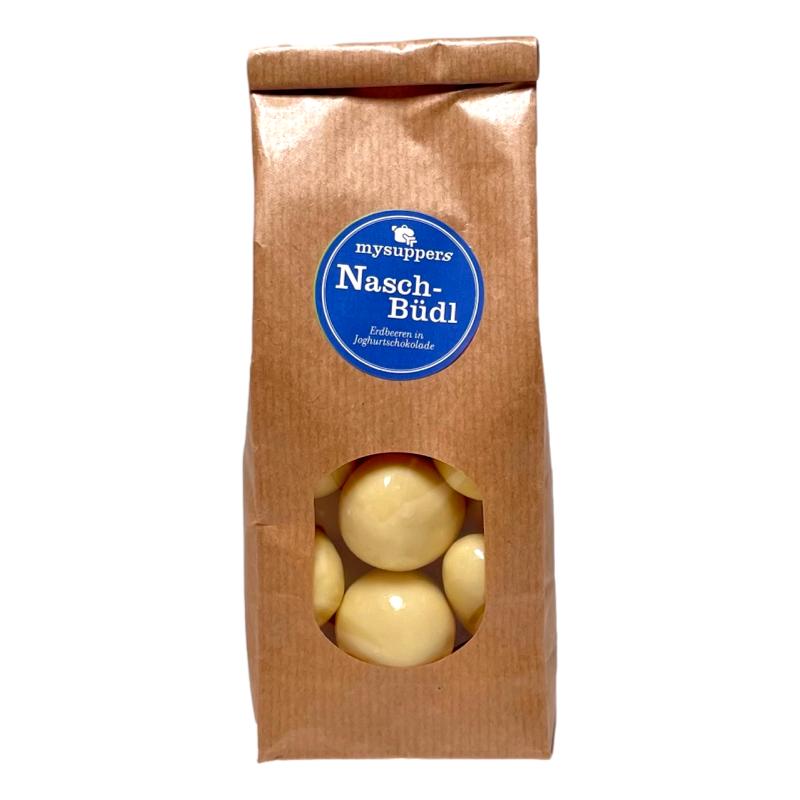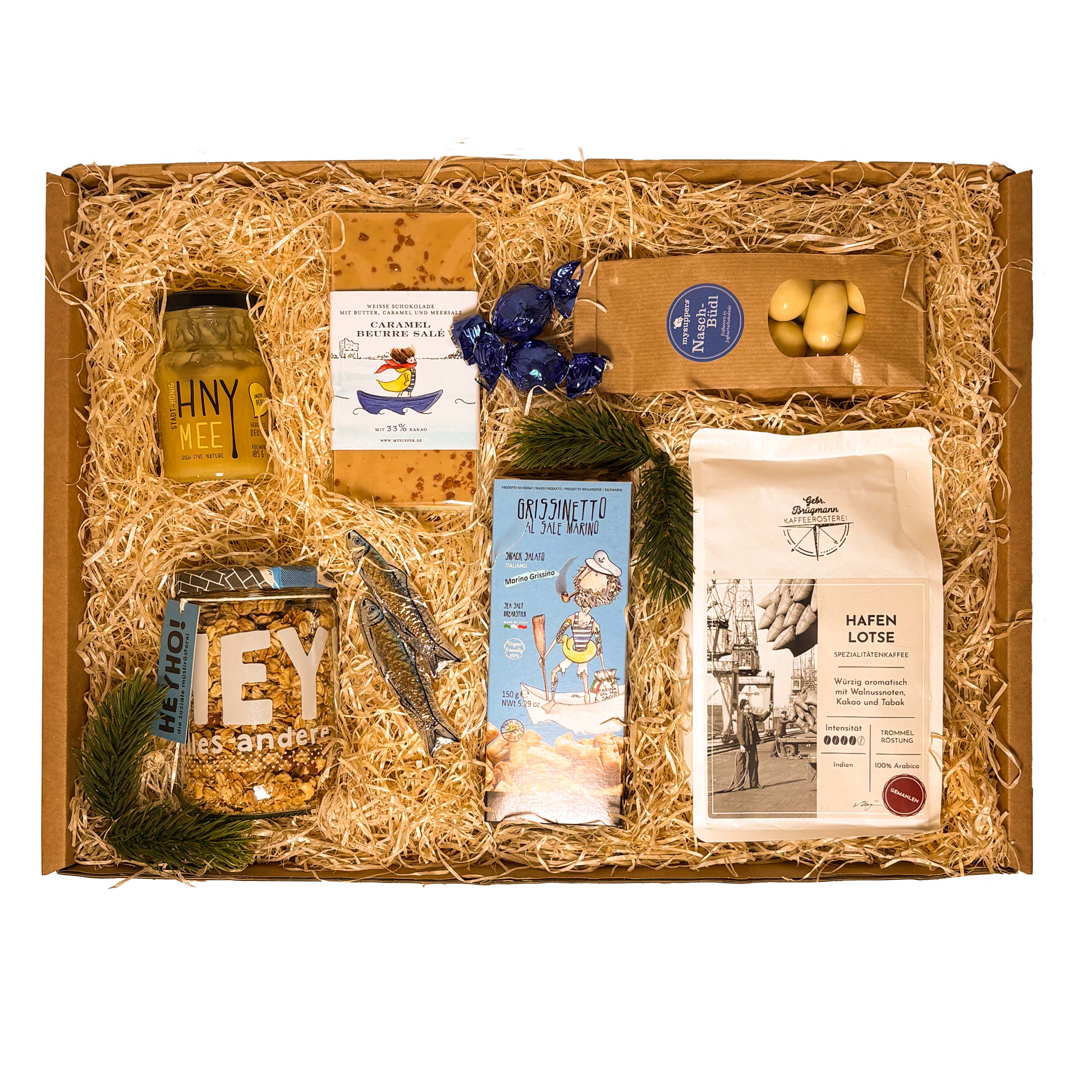Eine Tüte Naschbüdl, das sind Erdbeeren mit einer feinen Joghurtschoki ummantelt, salzige Kapitänscracker, 2 Schokosardinen, HeyHo Granola “Saltcity”, Kaffee Hafenlotse, Schoki Caramel Beurre Salé, HNYMEE Honig, 2 dänische Schokokugeln.