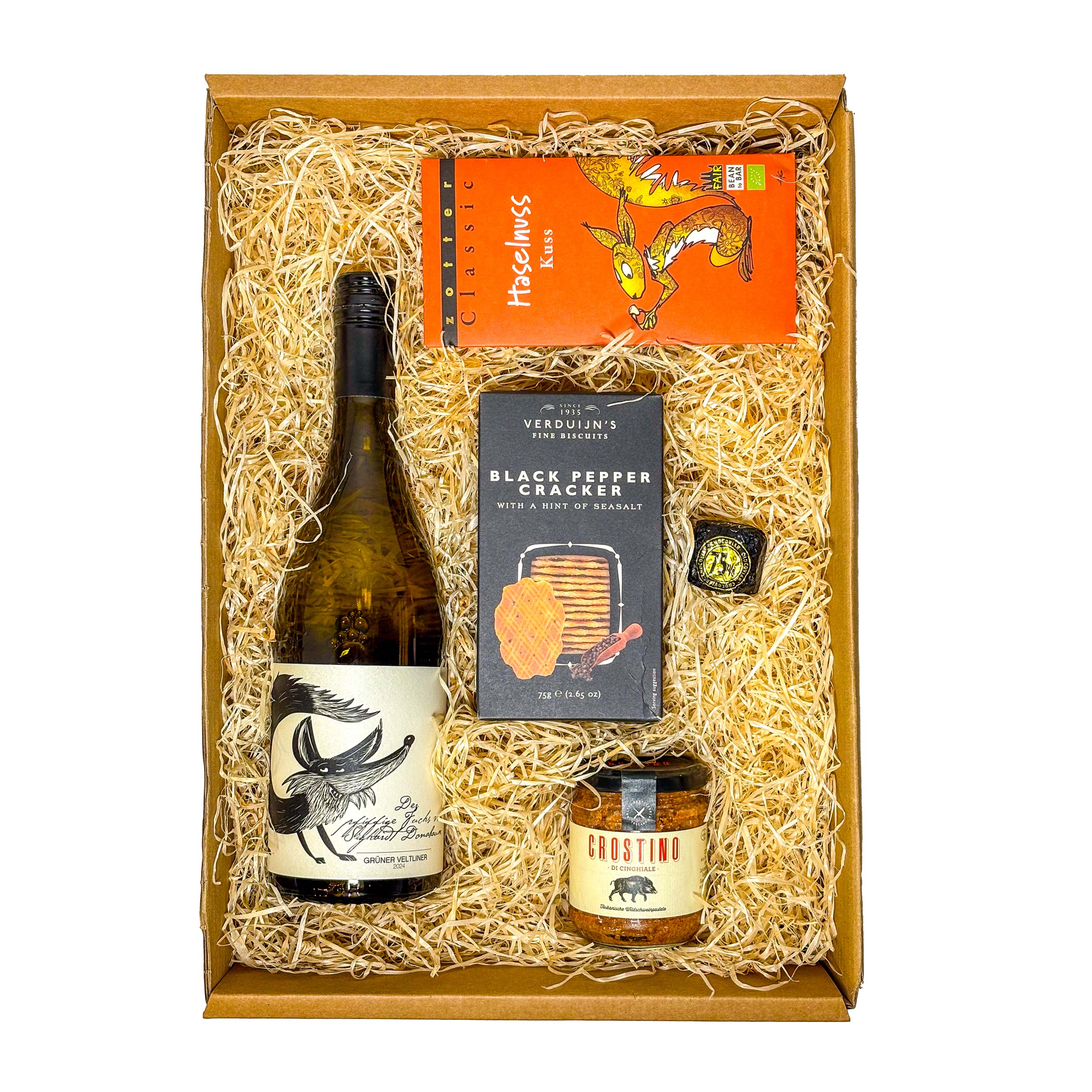 Statt Pils und Korn ist bei uns mit Liebe verpackt: ein sehr köstlicher Grüner Veltliner mit hübscher Fuchsillustration, Black Pepper Cracker, einer Schokolade von Zotter und einem Wilschweinpasteten-Aufstrich.