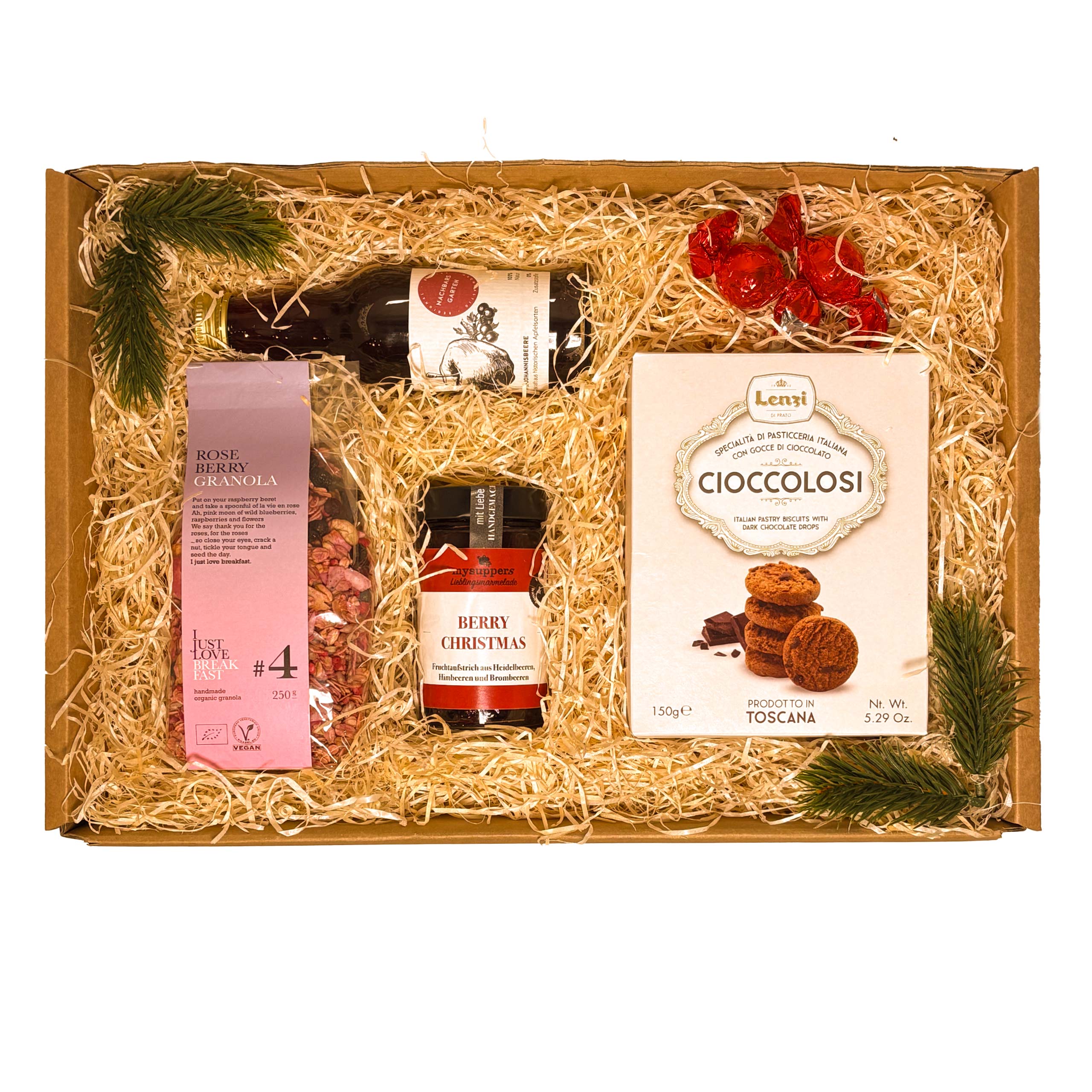 Diese Geschenkbox enthält: 1x Rose Berry Granola, 1x Fruchtaufstrich „Berry Christmas“, 1x Kekse „Cioccolosi“, 1x Apfel-Johannisbeer Direktsaft, 2x Schokoladenkugel - rot