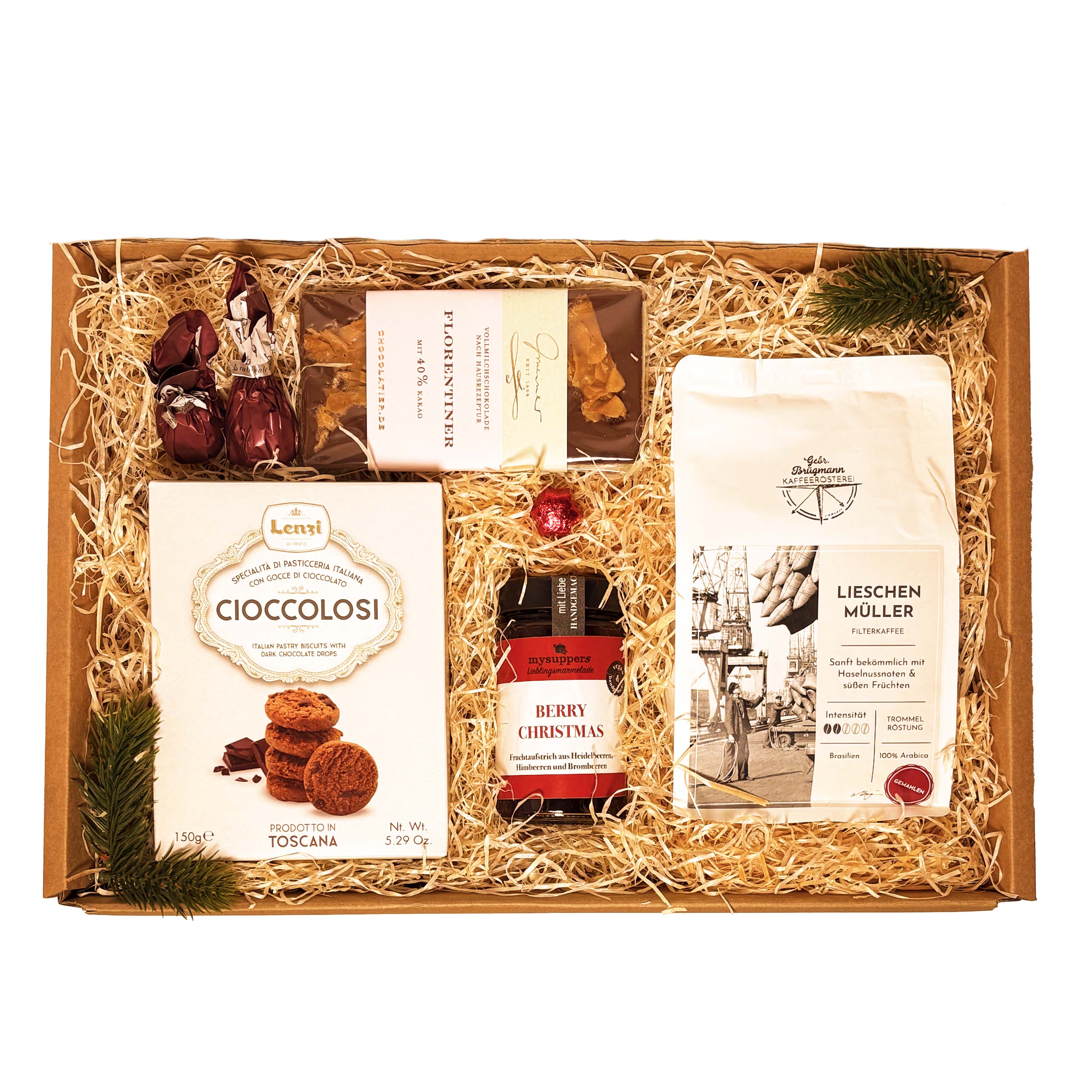 Lieschen Müller – unsere aromatische Kaffeeauswahl lädt sich ein: feine Biscuits mit beerigem Fruchtaufstrich, einer handgeschöpften Tafel Florentinerschokolade und Zwergfeigen in Salzkaramellschokolade.
