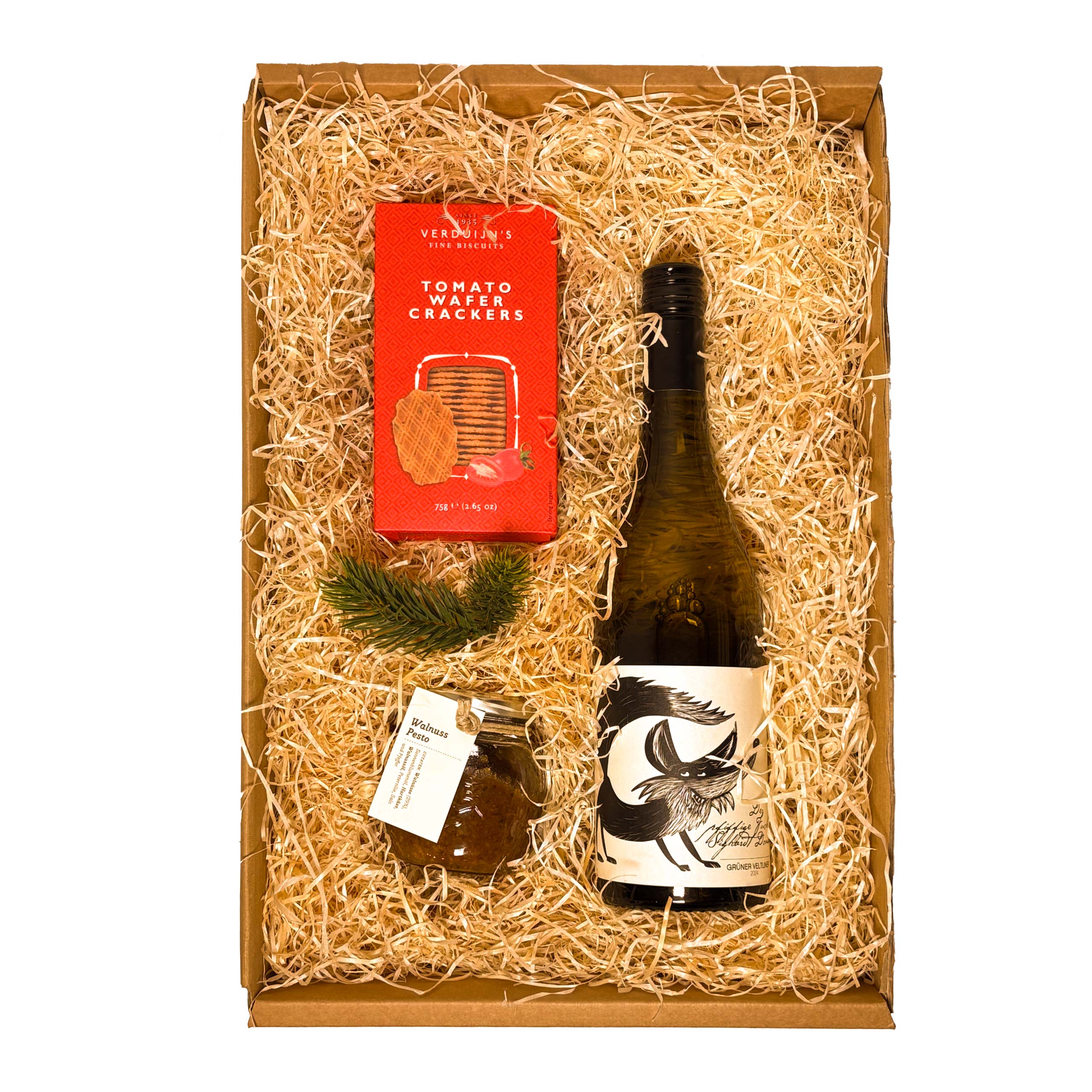 Ob im Sommer oder Winter – der grüne Veltliner mit hübscher Fuchs-Illustration passt immer, ob zu herzhaften Tomaten Crackern mit feinem Walnuss-Pesto.
