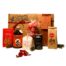 Alles Gute Gaben. Im Mittelpunkt: der preisgekrönte Worlds Best Flavoured Zanzibar Gin Tumeric Nr. 1., dazu ein Beutel Tartufi dolce stracciatella, portugiesische Salzflocken, zwei dänische Schokokugeln, Tomate-Waffel-Cracker, süß-salzige Verführung, Linguine Peperoncino Rosso.