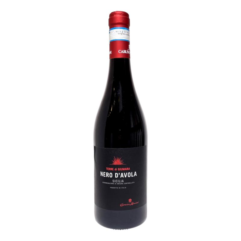 vollmundig trocker Rotwein aus Sizilien - dunkelrot im Glas.