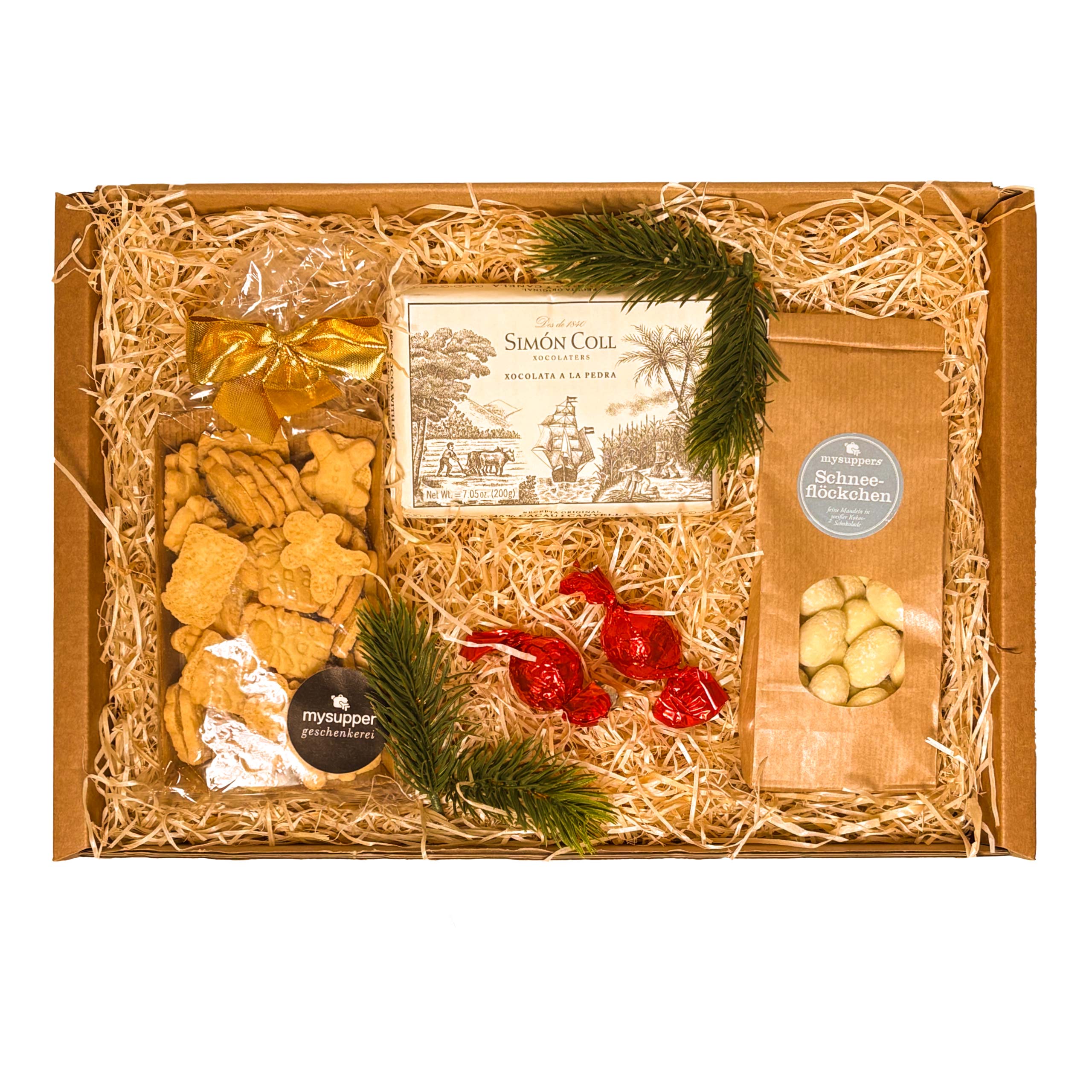 Diese Geschenkbox enthält: 1x Spanische Trinkschokolade, 1x Schneeflöckchen, 1x Spekulatius-Konfekt Butter, 2x Schokoladenkugel - rot