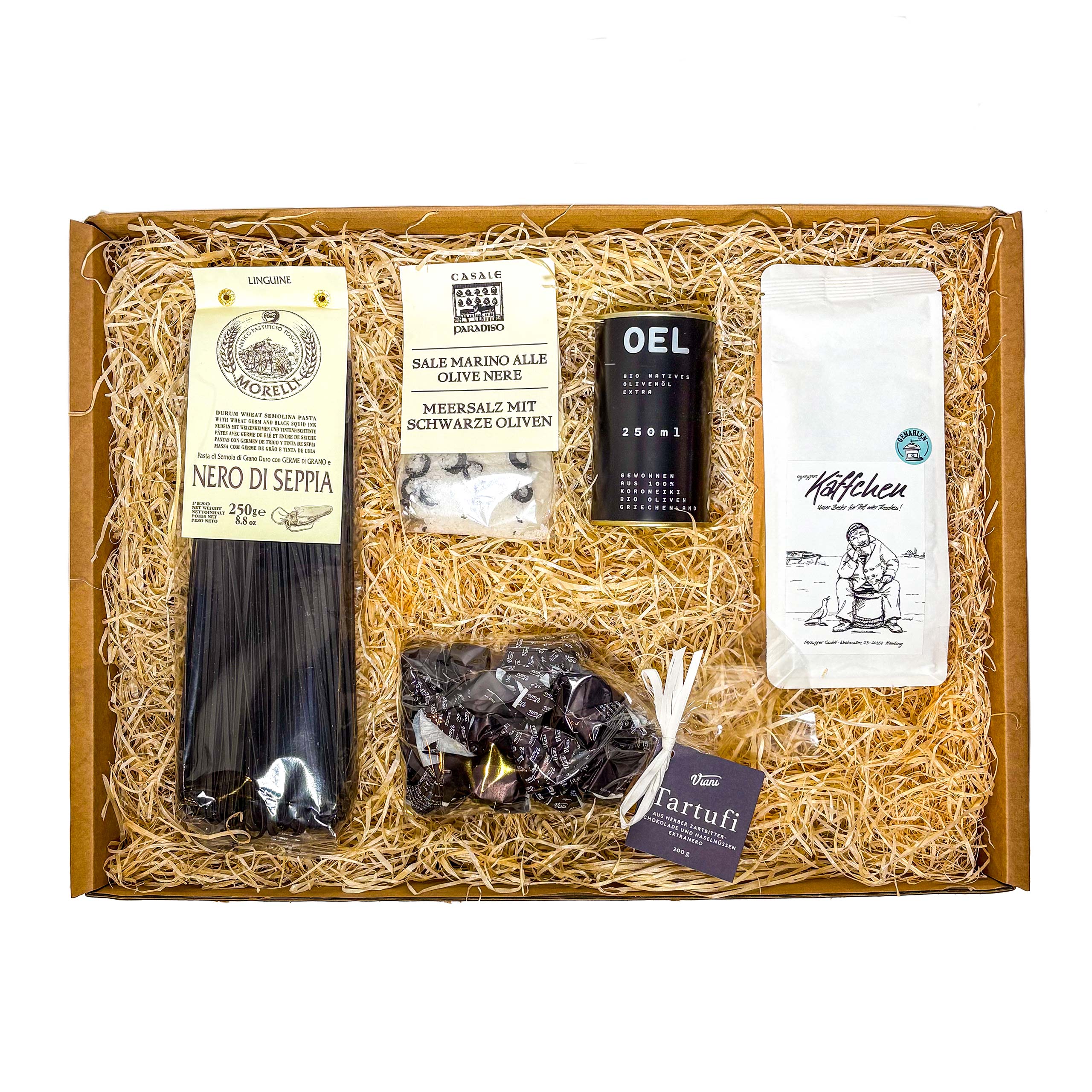 Nicht nur etwas für Schwarz-Weiß-Seher ist diese Kombi: Meersalz mit schwarzen Oliven, ein edles Olivenöl aus Kampanien, Trüffelpralinen aus dem Piemont – mit dunkler Schokolade, schwarze Linguine aus der Manufaktur Moretti und dem Kaffee „Käffchen“ aus der Rösterei Dockland mit Hamburger Jung auf dem Etikett.