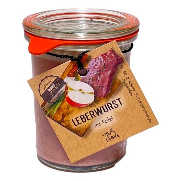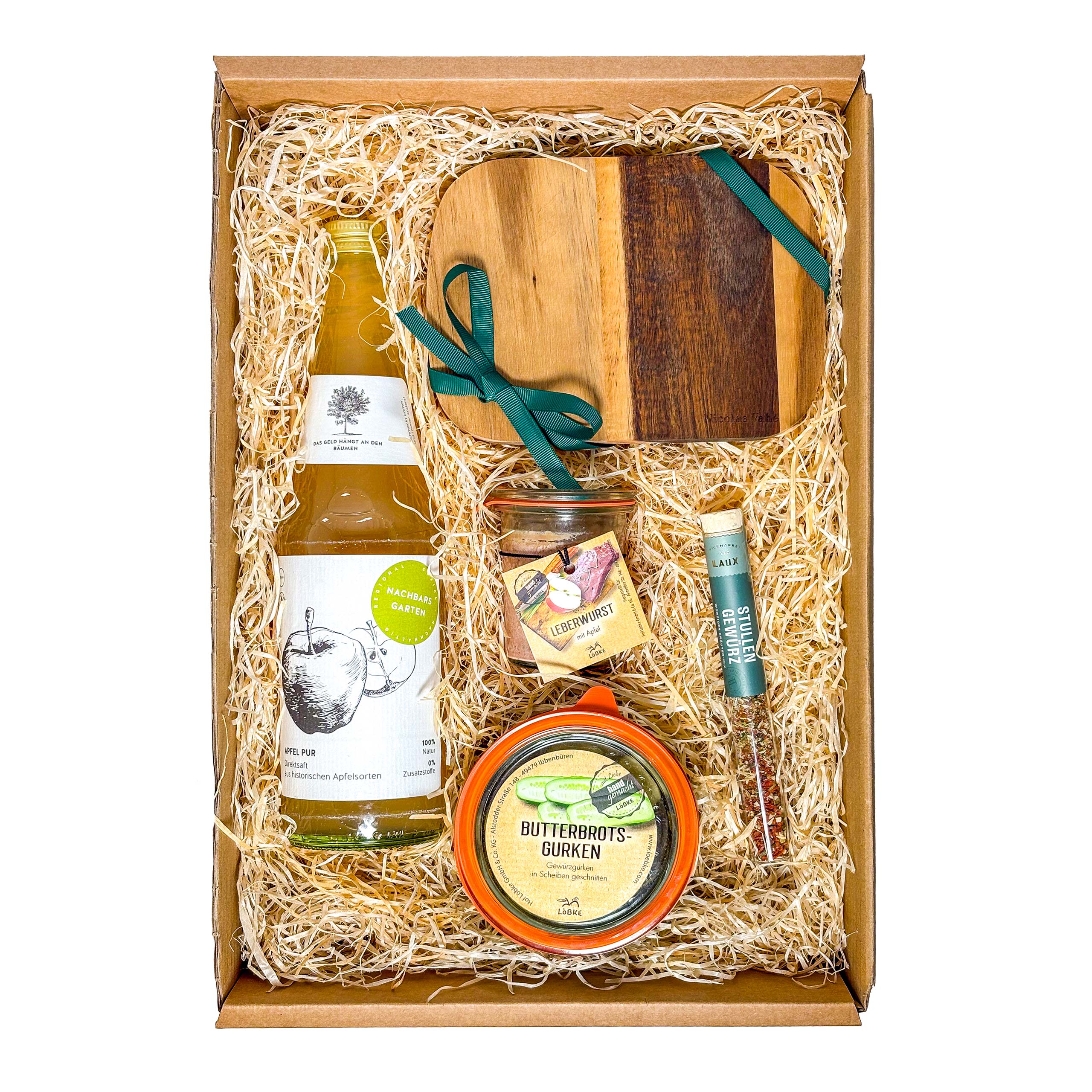 Diese Geschenkbox enthält: 1x Holzbrett aus Akazienholz, 1x Butterbrotsgurken, 1x Gewürzröhrchen „Stullengewürz“, 1x Leberwurst mit Apfel, 1x Apfel-Direktsaft
